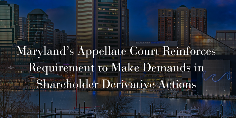 In Howard Nathanson, et al. v. Tortoise Capital Advisors, LLC, the Appellate Court of Maryland (the “Court”) reinforced Maryland’s commitment to requiring shareholders to make demands upon boards of directors prior to filing a derivative suit. The Court upheld Maryland’s “very limited exception” to not making such a demand prescribed in Werbowsky v. Collomb, 362 Md. 581 (2001).